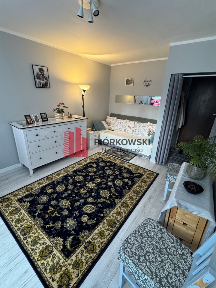 Pomimo niewielkiego metrażu mieszkanie zostało rozsądnie zaprojektowane. Główną część stanowi ustawny pokój w kształcie zbliżonym do kwadratu. Po prawej stronie znajduje się wnęka pełniąca funkcję części sypialnianej. Tę przestrzeń można w prosty i estetyczny sposób oddzielić od reszty pokoju.