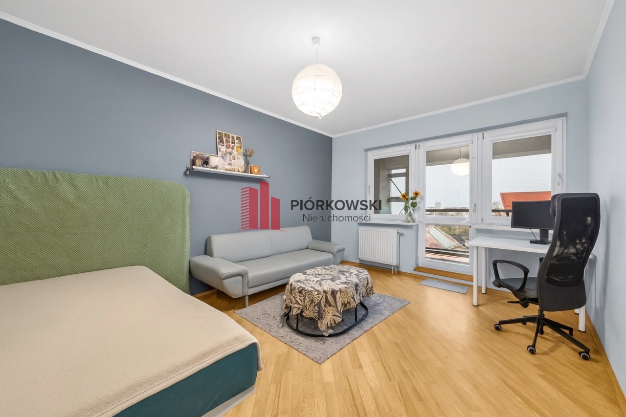 Z pokoju wychodzimy na zabudowaną loggię 6–8 m² z pięknym widokiem na park od strony południowo-zachodniej.